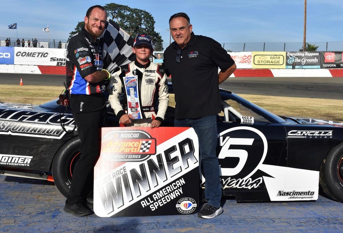 11-year-old Vito Cancilla of Martinez qualified setting a new track record and then won the 30-lap AAMCO of Auburn Jr. Late Model main event. Cancilla started p3 after the invert but quickly took the leader three wide and led the way through several restarts. A late caution set up a four-lap sprint to the finish. Former Mini Cup champion Colton Nelson of Auburn attempted to battle for the lead, but fishtailed on the backstretch and slammed the wall. Cancilla dashed away for his second win of the year at Roseville's All-American Speedway.